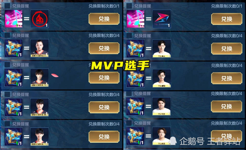 而MVP推荐换两个,即两位天才少年AG超玩会.一诺与TS.暖阳,之所以首选这两位选手是因为他们在常规赛分列最佳选手榜前二,特别是一诺堪称MVP收割机,拿到了19个局最佳,季后赛表现同样优异,而暖阳则是TS的节奏带动者,所以两位选手获得总决赛MVP称号的概率最高,大家同样依据自己支持的战队选择兑换!