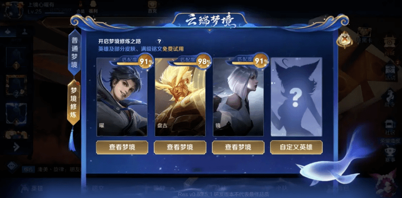 在开出了这三位英雄的玩家大不数就是主玩上单和打野的位置,这次的修炼梦境中的设定是玩家只能看出熟练度比较低的英雄,也就是说常玩的英雄也就属于同一个阵容的比较多,现在版本的曜和盘古没有那么强势,选择镜就可以了,作为打野还是很强的!