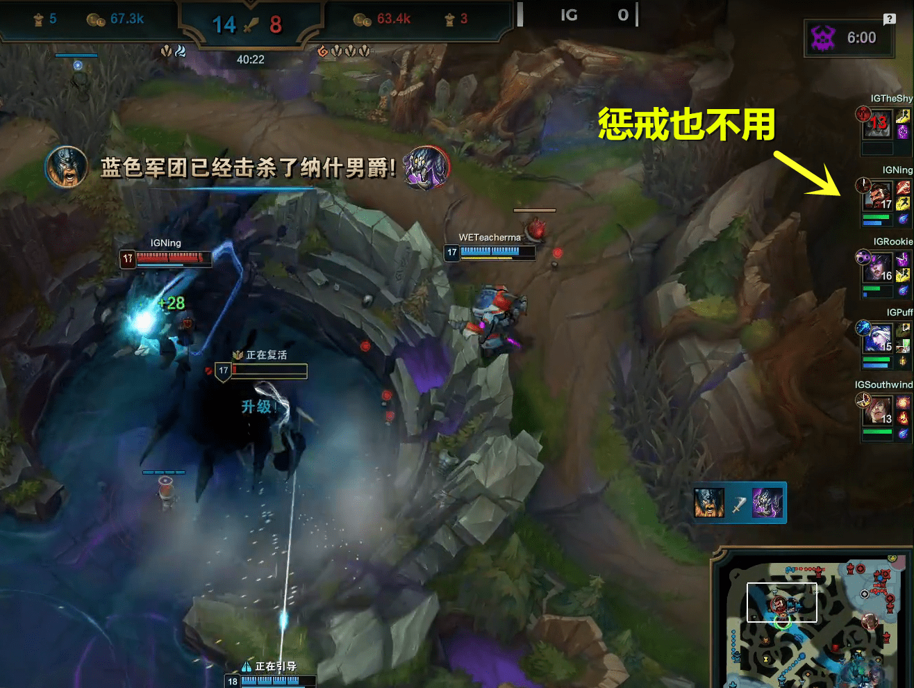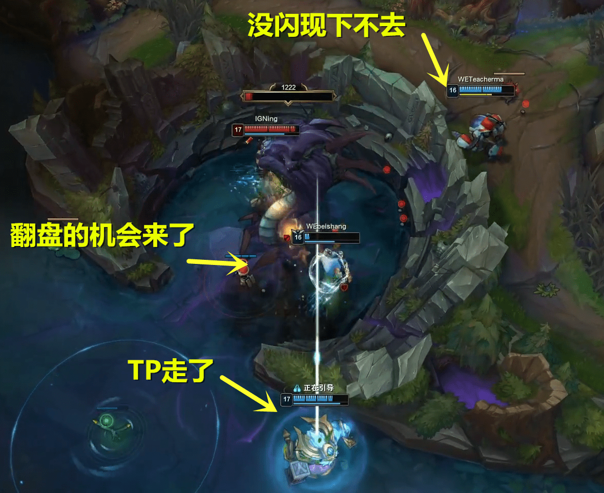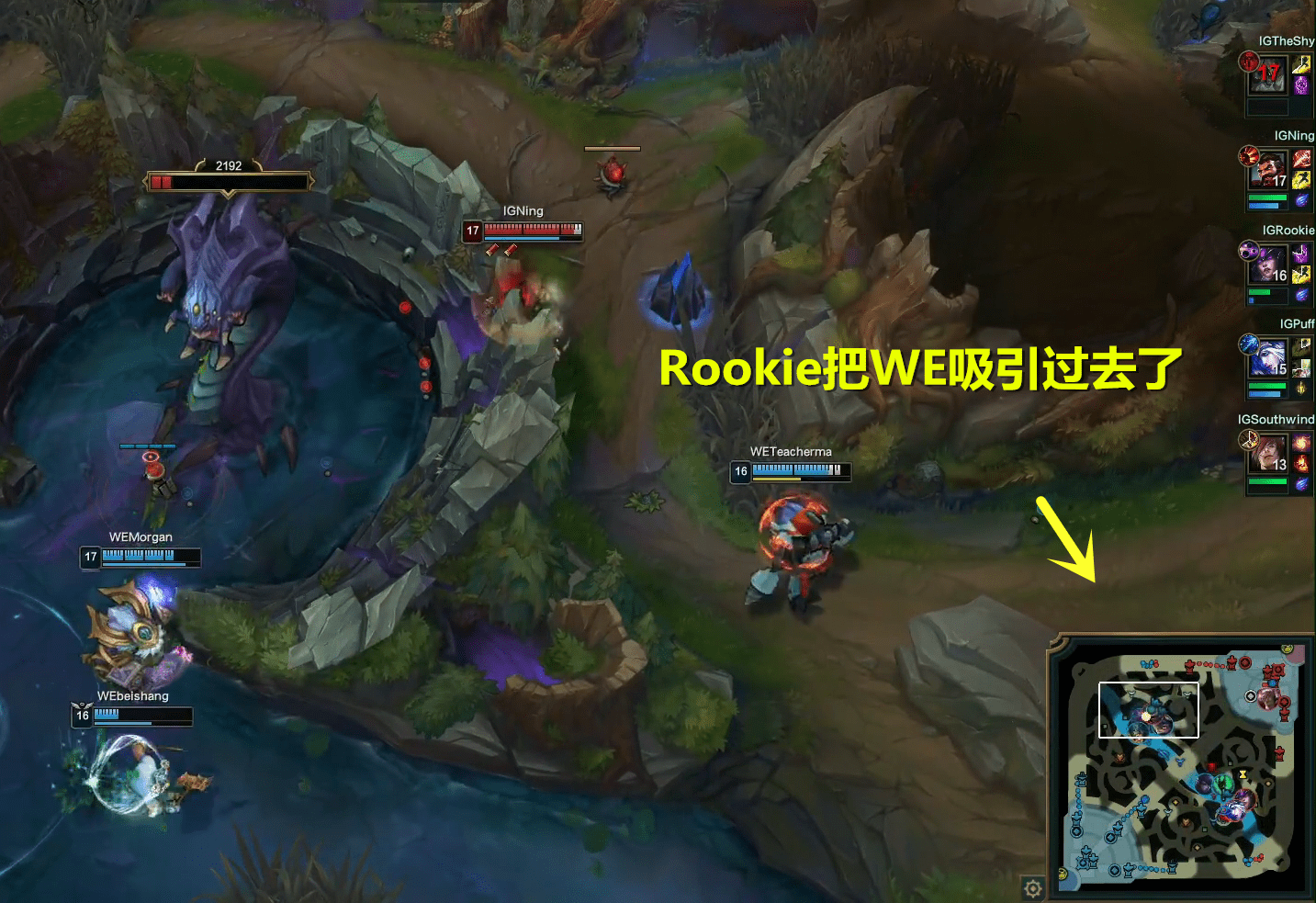 而WE上单为了阻止Rookie,把正在打大龙的奥恩都叫过去了,奥恩当时直接就原地传送,放弃大龙去打远古龙。而就是这一波操作给了IG翻盘的机会,大家注意看甲子标注的点。