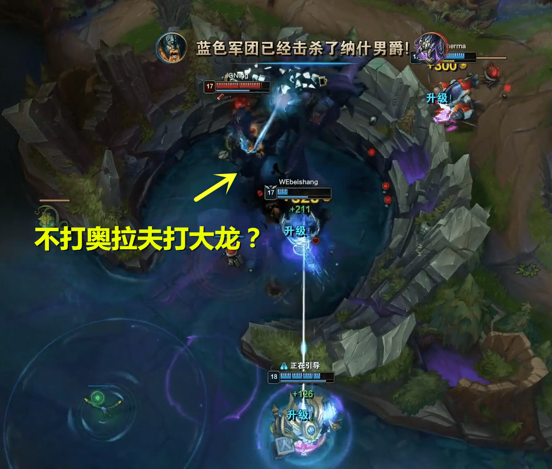 奥恩已经TP走了,大龙坑只剩下WE一个残血的奥拉夫,以及一个下不去龙坑的兰博,这一波决策是WE的失误,因为宁王是满状态,他想击杀残血的奥拉夫简直易如反掌,更可以随便抢掉大龙。