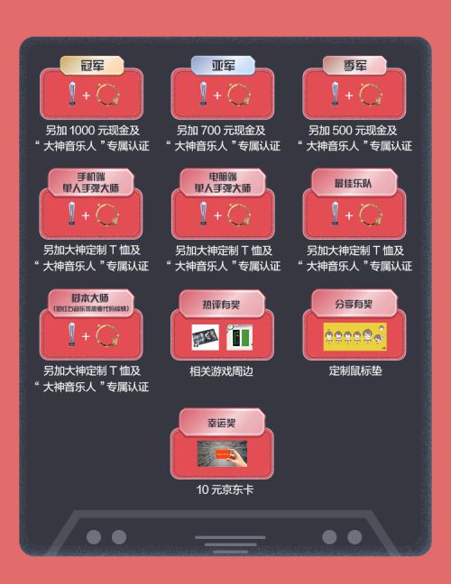 活动结束后,大神评审团将综合考虑参赛作品的得票数、阅读量和互动数,为参赛作品评分。在所有参赛作品中总分排名前三名的玩家,将瓜分丰厚的现金奖励和各式好礼,还能把专属的“大神音乐大赛”奖杯抱回家!各分区也将角逐出各自的总分排名前三名获取丰厚实物奖励和游戏周边。快上大神投稿音乐作品,让世界听见你的声音。