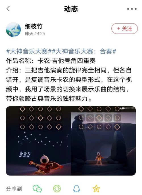 就算没有钢琴和吉他,也能在游戏里成为演奏家。包括但不限于《逆水寒》、《一梦江湖》、《明日之后》、《光遇》、《我的世界》、《守望先锋》、《天涯明月刀》等,只要是有乐器玩法的游戏,都可以成为你的乐器!玩家利用游戏中的乐器玩法功能演奏乐曲并录制视频即可投稿参与本次“大神音乐大赛”。