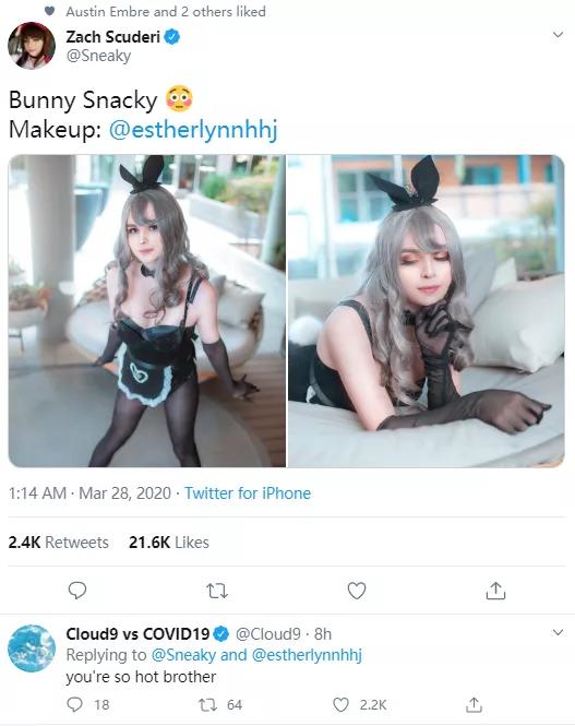 今日前C9 AD选手Sneaky在推特上传了他的最新作品,C9官推在下方评论道:你太性感了,哥们儿。