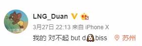 昨日LNG不敌eStar,除了LNG中单Maple表现遭质疑外,LNG辅助Duan发挥也差了一些,有部分网友表示应该调查一下Duan有没有打假赛,对此Duan赛后发布微博回应:“我的 对不起 but 赌狗 biss”