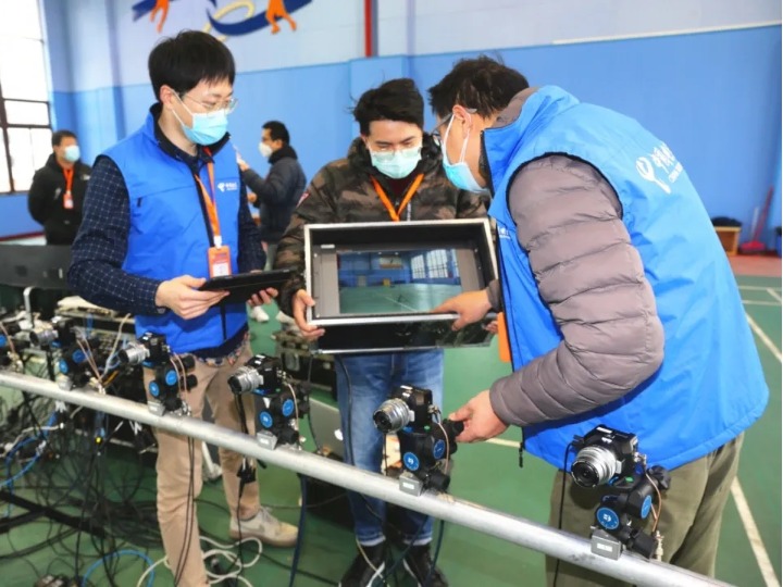 中国电信上海公司工作人员为直播体育课调试设备。图片由中国电信上海公司提供