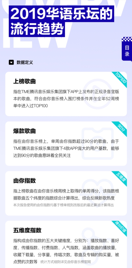 作为中国领先的在线音乐娱乐平台,腾讯音乐娱乐集团一直聚焦于用户和内容的深度连接,过去十年间,以创新的产品与服务、多元的内容、先进的技术,逐渐成为连接音乐人与用户、发挥音乐价值的上佳平台,在不断丰富用户音乐阅历的同时获得了行业内外的广泛认可。根据腾讯音乐娱乐集团2019Q4及全年财报显示,第四季度在线音乐付费用户达到3990万,同比增长47.8%,在线音乐月活用户6.44亿,在线音乐付费率更历史性地突破6.2%。多维度的庞大用户体量为由你音乐榜提供了稳定的大数据支撑,而基于在线音乐服务与社交娱乐服务的全产品、生态化平台底蕴,集团也为由你音乐榜的推行注入了不断探索、大胆创新的品牌基因,对于整体数字音乐产业而言,也进一步奠定了由你音乐榜及相关报告的权威性与参考价值。