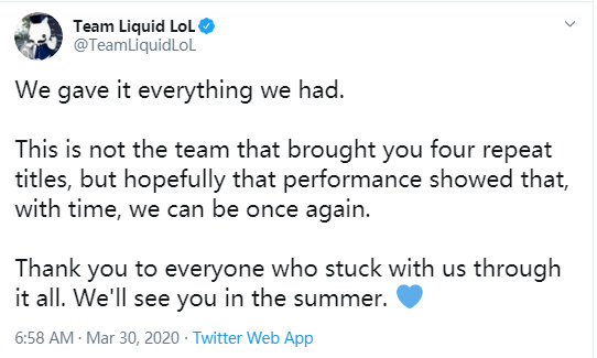 3月20日, LOL官方推特发布一则LCS赛区比赛信息:输给C9后,TL战队无缘季后赛,这是LCS历史上卫冕冠军第一次错过季后赛。