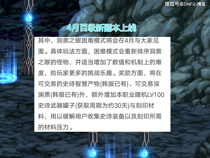 之所以4月出新百级副本,这段时间的“空档期”,是为了玩家“爆肝”史诗装备。差不多等史诗装备凑齐,洞察之眼困难模式,也就可以打了。而且,该副本的道具奖励,同样吸引着玩家。除了新可交易史诗上线外,还有可交易深渊票,以及额外增加本职业随机100级武器袖珍罐。在获取周期方面,比无相冥渊要短,30天左右就能得到。