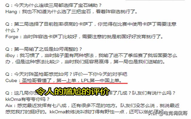 而除了小白之外,在今天LNG和VG的比赛中,也发生了一件很有意思的事情,就是VG2:1取胜之后,Cube选手赛后选手居然直接给圣枪哥一个超高评价,他称:圣枪哥看懂了,第一上单,LPL第一中国上单。不得不说;对于Cube的这波评价真很少见,一般按惯例赢得队伍都是嘲讽输得队伍或者选手,怎么今天Cube直接吹起对手来了!
