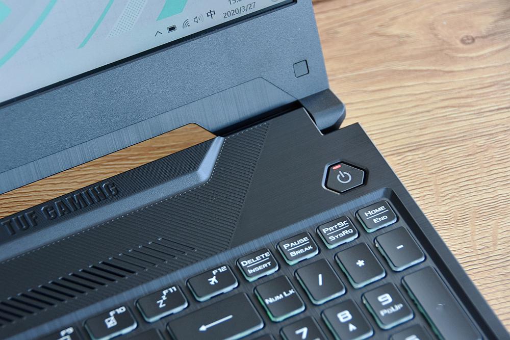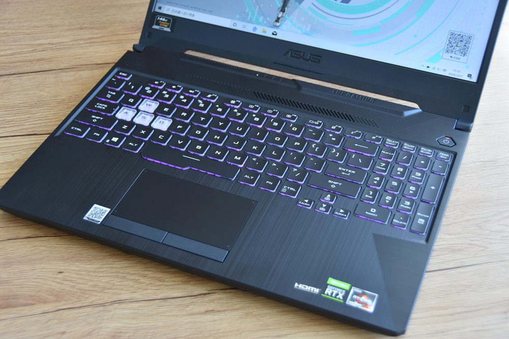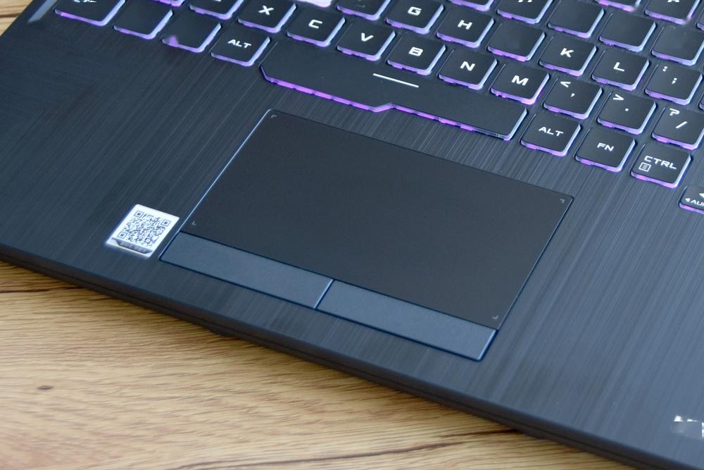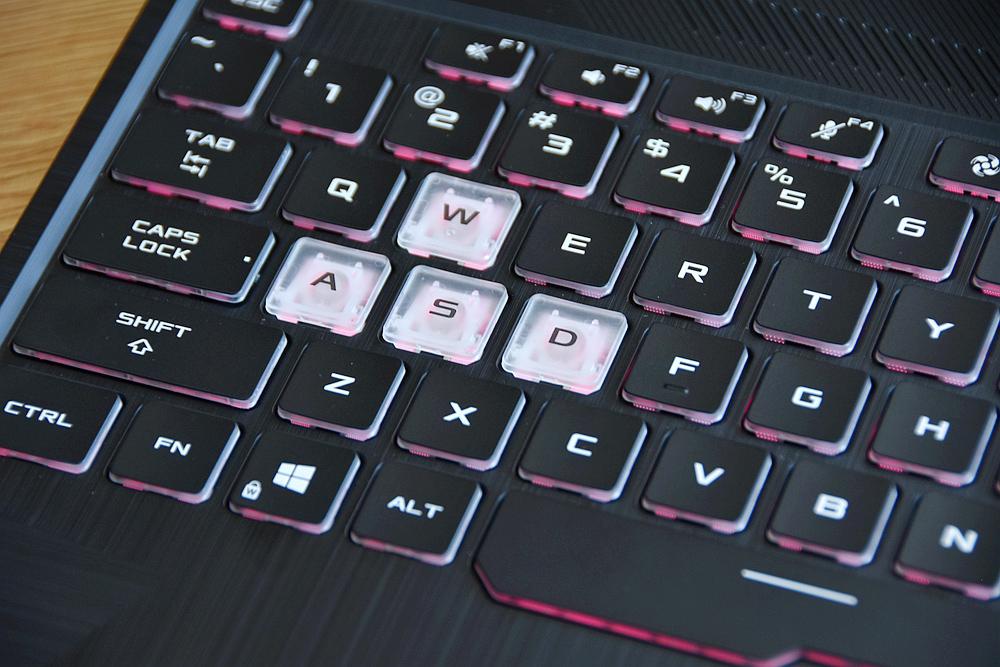 相较于飞行堡垒系列,天选在C面的设计上变化并不大,只是掌托上少了“TUF GAMING”的Logo。键盘没有采用RGB灯效,仅仅是三级可调背光键盘,多色交替变换。特殊处理的W、A、S、D按键,以及加宽设计的空格键,都是熟悉的飞行堡垒家族设计。