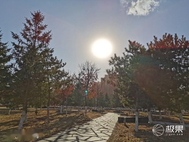 对着光线强烈的太阳拍摄了一张大逆光照片,如果是使用其他手机,这样的情况下,太阳周围的光线一定会晕成一片,而使用荣耀30S拍摄的照片太阳轮廓竟然被保留了下来,同时周围树木的细节也能清晰的表现。