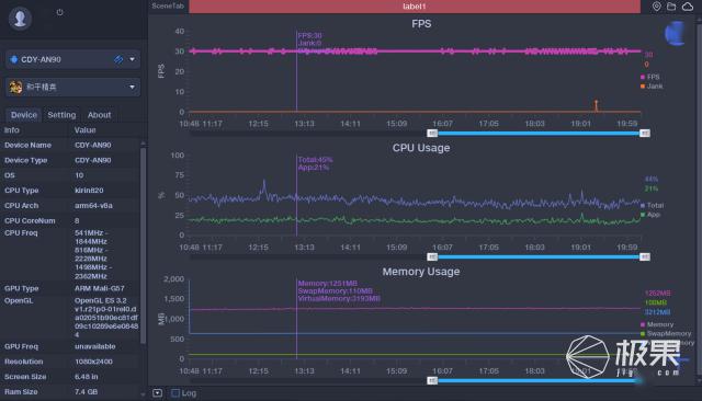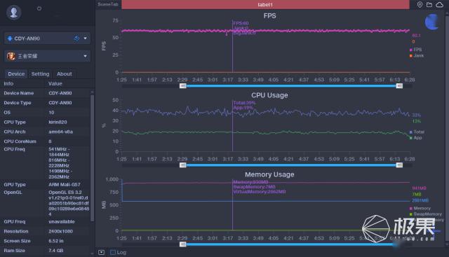 使用专业的手机曲线记录软件,记录手机在运行大型游戏时FPS、处理器、运行内存的实际利用率,来实际测试手机的性能表现,首先我们开启一款FPS游戏进行一局的游戏,通过曲线记录我们能够看到,游戏中FPS一直保持在30FPS的最高支持帧率下运行,同时游戏只占用处理器18%左右的资源,CPU总使用率40%左右,内存占用率只有1G,虚拟内存占用2.5G左右。