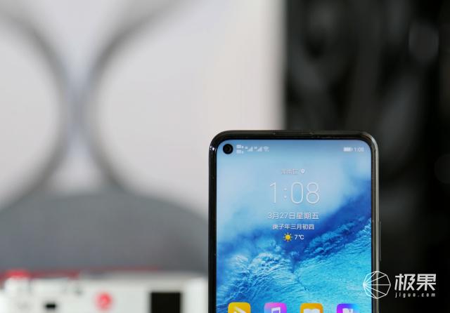 屏幕开孔放在左上角的位置,使用了工艺较为复杂的盲孔设计方案,将前置镜头的孔径进一步缩小,镜头直径只有3.05mm,再通过系统显示上的优化,前置摄像头的存在感进一步降低。