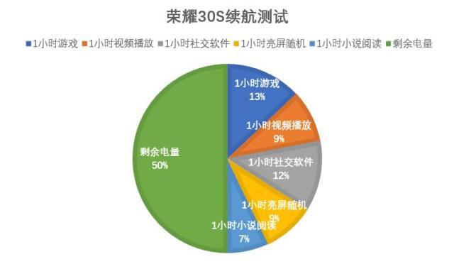 续航表现,我们在5个小时内,分别对手机进行了不同场景的整块时间使用,并记录电量减少情况,并制作了饼状图展示手机的续航性能。经过5个小时的连续不灭屏使用,手机还有50%的电量,证明手机在重度使用的情况下,足以满足用户一天的续航,不用担心续航不足的问题。