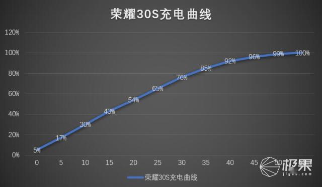 为了更好的记录手机的充电速度表现,制作了充电曲线图,每5分钟记录手机的充电电量,并最终以充电曲线的方式展示,大家可以直观的看到手机的充电速度表现,手机在30分钟内,就将手机充了70%的电量,经过53 分钟将手机从5%电量完全充满。