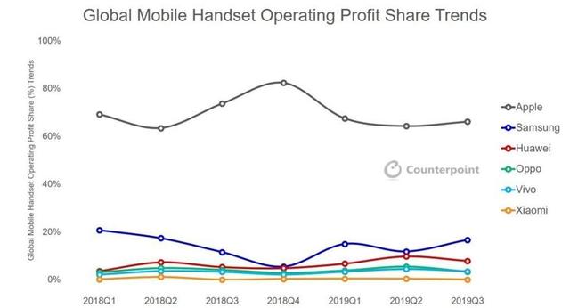 作为高端市场的老大,苹果吃下了行业最多的利润。Counterpoint的数据显示,在去年第三季度,苹果拿下了智能手机行业利润的66%,而苹果当期出货量仅占全球份额13%;三星拿了17%的利润,剩下的才由其他厂商瓜分——华米OV们赚的都是辛苦钱。