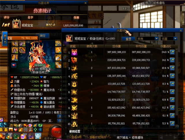 在20秒打桩中旭旭宝宝打出1万6千亿伤害反超CEO4千亿,再次登顶第一。不过,旭旭宝宝红眼毕业的这一套有小小缺陷,因为地狱套的套装效果跟红眼血气唤醒技能冲突,本来红眼是血量越低攻速和移速加成越多,但是因为地狱套能回血原因,打着桩血就回满了,完全压不低血量,自然无法享受到血气唤醒最大化加成,从而无法触发军神套最大化的效果,伤害自然要低不少,目前只有军神神话耳环能弥补这一缺陷,但是旭旭宝宝没有。