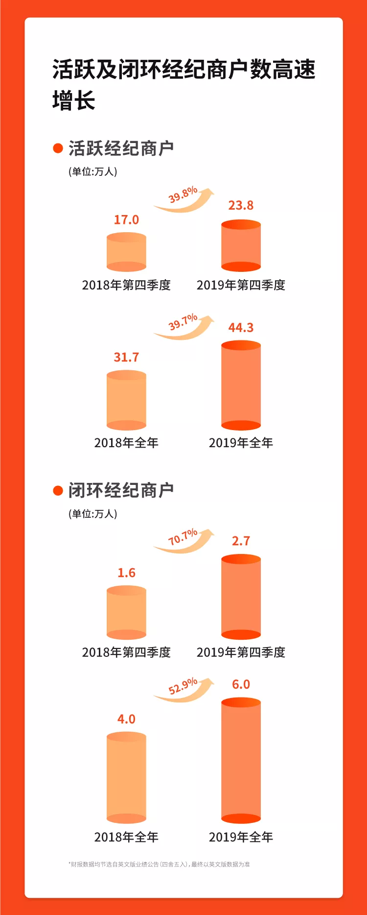 商户规模与交易方面,2019年第四季度,房多多平台上的活跃经纪商户数为23.8万,相较2018年同期的17.0万增长39.8%,2019年全年累计活跃经纪商户数达44.3万;第四季度,在房多多平台上完成闭环交易的经纪商户数为2.7万,同比增长70.7%,2019年全年累计完成闭环交易的经纪商户数达6.0万。
