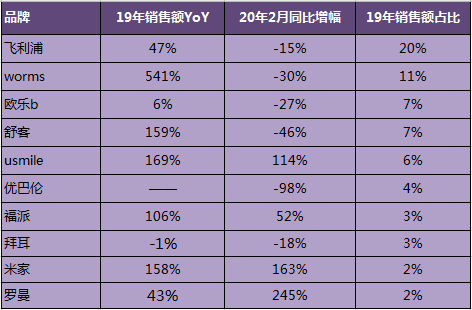 • 2020年2月,品牌usmile,福派,米家,罗曼依旧在疫情期间强势增长,同比增幅分别是113%,51%,162%,245%