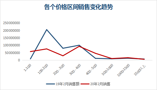 • 2019年,100-200元,300-400元是消费者购买的主力价格区间。但是在2020年2月,这2个价格区间销售额都出现了一定的下滑。