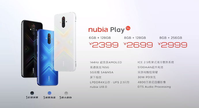 手机硬件方面:努比亚Play 5G手机坚持了对于产品性能一贯的高要求,搭载了骁龙765G这颗 “5G神U”。支持SA+NSA双模5G加上AI动态网络,可根据场景智能优先调配使用高速模式。