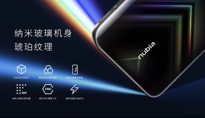 机身背部则采用了强韧而细腻的纳米玻璃材料,并以3D彩色打印技术巧妙地呈现了琥珀纹理般惊艳的观感,用户使用过程中配合自然光影流转在机身上的效果,美轮美奂且极富个性。