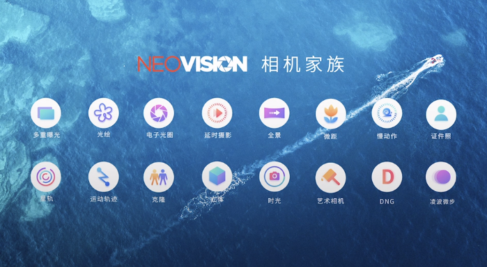 全新的NEOVISON影像系统,提供了光绘视频,凌波微步,星轨等更多好看、好玩的影像功能,极大降低了用户拍摄创意视频的门槛和难度,通过简单而人性化的交互,就能实现大师级的拍摄效果。