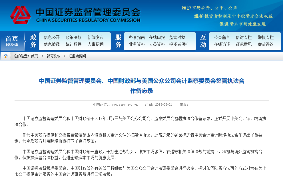 早在2013年5月,中国证监会、中国财政部就与美国公众公司会计监察委员会签署执法合作备忘录,正式开展中美会计审计跨境执法合作。