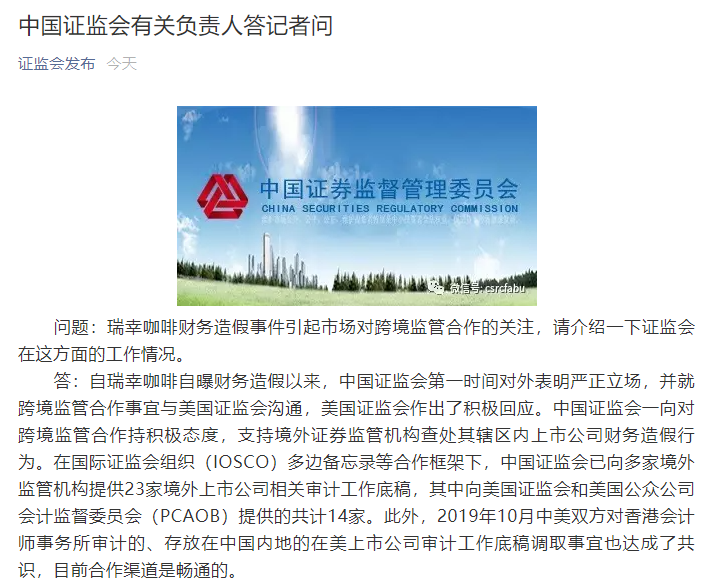 答:自瑞幸咖啡自曝财务造假以来,中国证监会第一时间对外表明严正立场,并就跨境监管合作事宜与美国证监会沟通,美国证监会作出了积极回应。中国证监会一向对跨境监管合作持积极态度,支持境外证券监管机构查处其辖区内上市公司财务造假行为。在国际证监会组织(IOSCO)多边备忘录等合作框架下,中国证监会已向多家境外监管机构提供23家境外上市公司相关审计工作底稿,其中向美国证监会和美国公众公司会计监督委员会(PCAOB)提供的共计14家。此外,2019年10月中美双方对香港会计师事务所审计的、存放在中国内地的在美上市公司审计工作底稿调取事宜也达成了共识,目前合作渠道是畅通的。