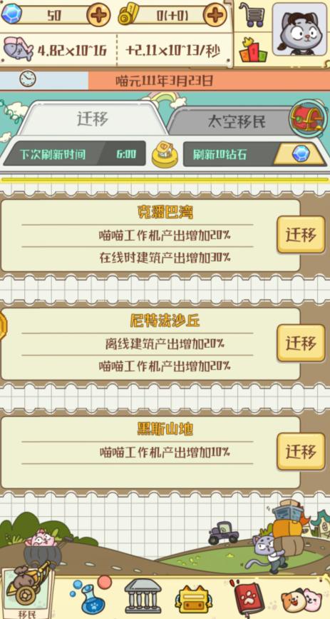 不过,伟大的喵星人怎么可能只满足于此呢?在游戏进行到某个时代后,各位喵星发展官还可以选择迁移到另一片土地,以更高的起点开始全新的征程!而发展到太空时代后,你甚至还能进行太空移民!!