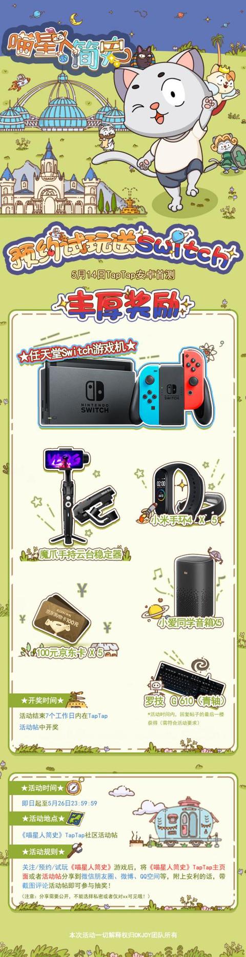 为了迎接首测,同时感谢玩家们的关注和支持,喵参谋特别为大家准备了丰厚的奖品!活动参与方式很简单,即日起至5月26日,前往TapTap搜索《喵星人简史》并预约并试玩游戏,即有机会获得任天堂Switch游戏机、小米手环、小爱同学音箱价值共5000多元的大奖!