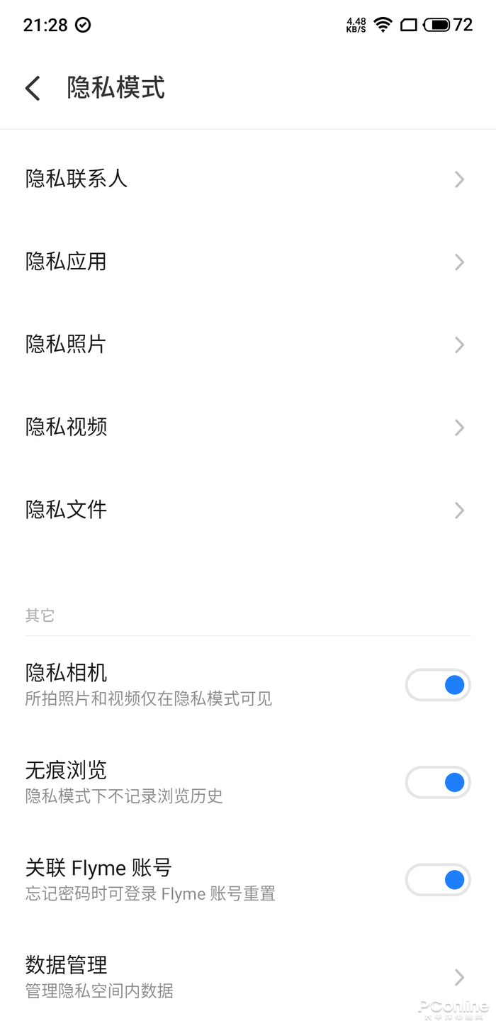 跟前面的EMUI和MIUI差不多,Flyme的隐私模式也是可以通过设置不同密码或指纹进分别进入主空间和隐私空间,主体功能也基本差不多。