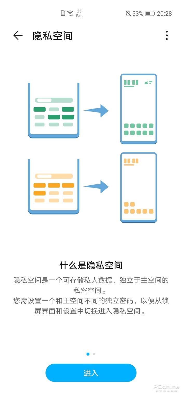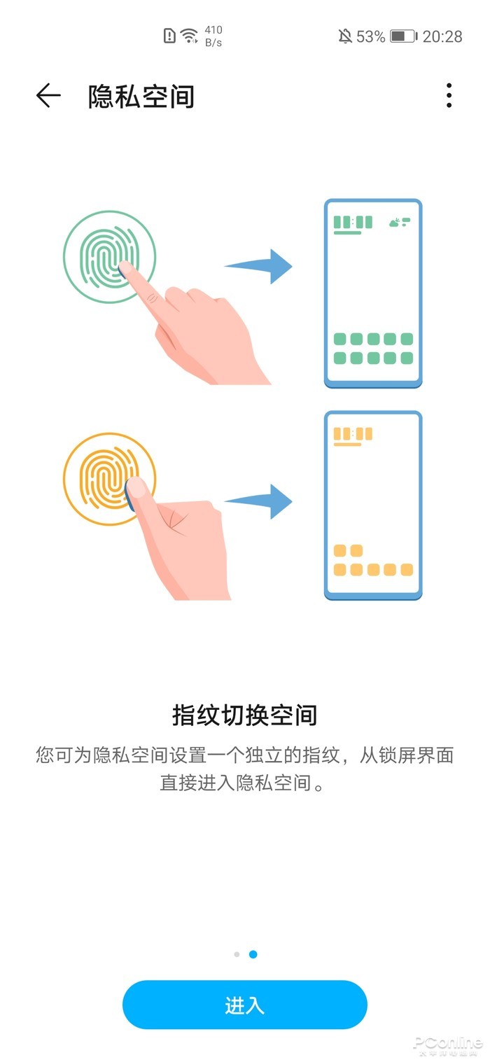 EMUI:隐私空间,可通过不同密码或指纹进入不同的空间,伪装性强