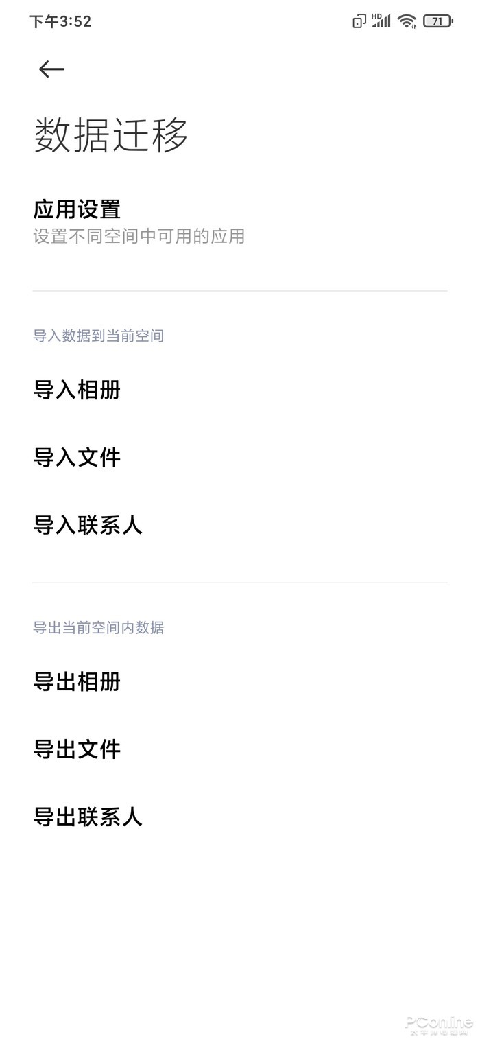 当然,你要是想玩火的话,MIUI也给你准备了玩火的设置选项。在分身空间的设置里,MIUI提供了数据迁移的功能,既可以把初始空间的数据导入到所处的分身空间内,还可以把分身空间的数据导出到初始空间。另外,还可以设置哪些应用在哪个空间使用,或者在两个空间同时使用。这就是我把这几个设置称为‘玩火’的原因,不过既然要追求刺激,那就贯彻到底咯。