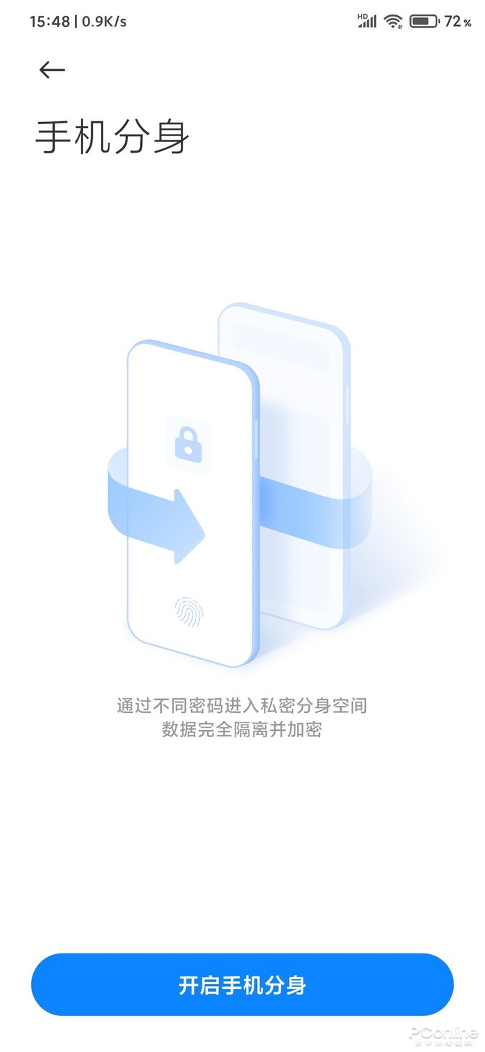 ‘手机分身’首次出现在MIUI8上,顾名思义,跟华为EMUI的‘隐私空间’差不多,可以通过不同密码或者指纹进入两个完全隔离的系统。