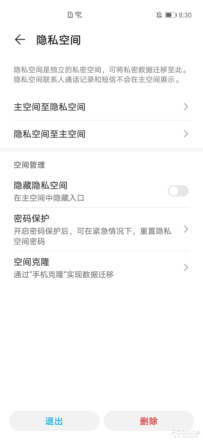 ‘隐私空间’更详细的设置只能在隐私空间里进行设置,主空间的‘隐私空间’单纯只是一个入口。可以看到,隐私空间里功能并不多,比较简洁。值得一提的是,主空间和隐私空间的数据可以迁移,但是不能共享,也就是一份数据只能存放在其中一个空间。仔细一想,有了这功能,确实不用怕查手机了,因为秘密都藏在了隐私空间里,主空间干干净净的。