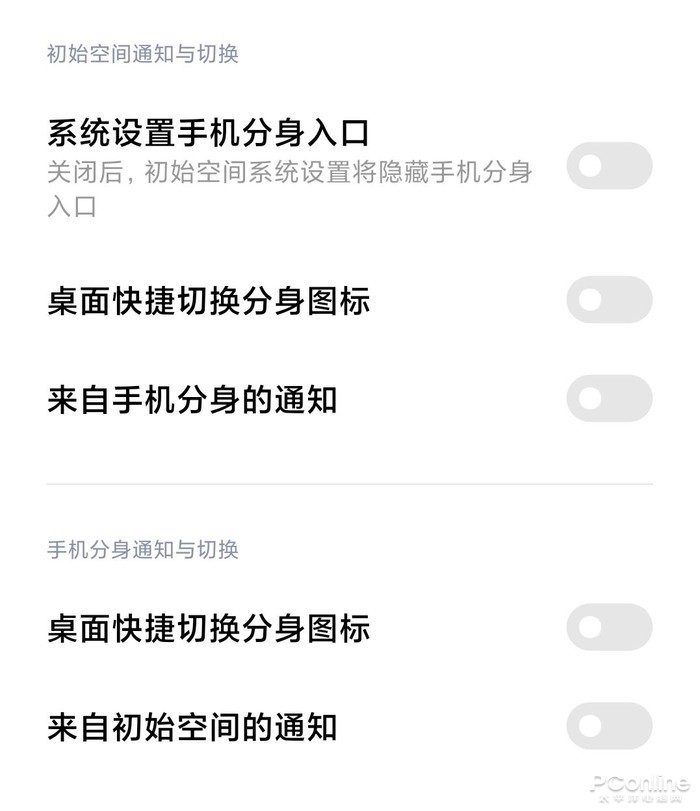 只要把图里这五个选项全关了,初始空间和分身空间就可以做到完全互不干扰,就像完全不存在分身空间一样。细心的人还会再把桌面图标布局、壁纸等等设置成和初始空间一样,可以说是天衣无缝。