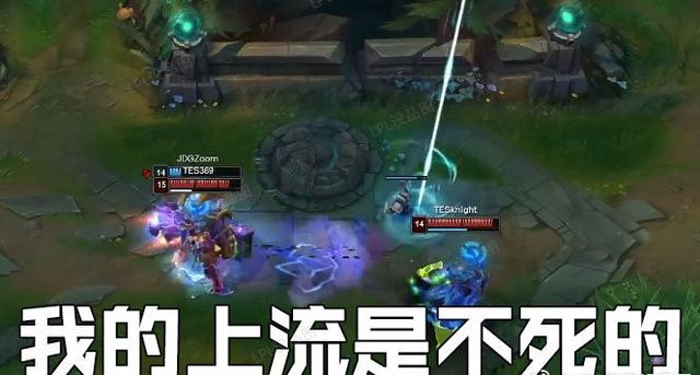 前期JDG二级抓上,打出来369的闪现,随后卡萨也来上路,可惜没有逼出zoom技能,前期冰女推线掌握中路线权,盲僧发挥如鱼得水,控龙拿资源TES掌握前期节奏。