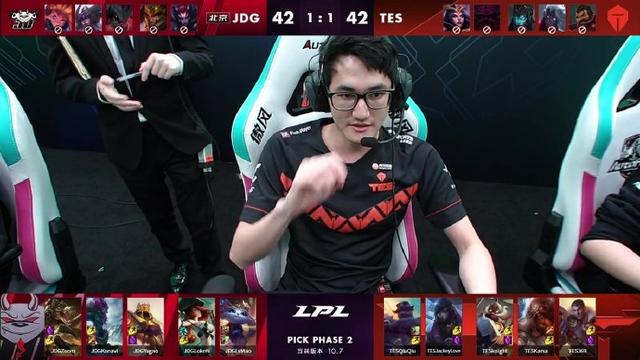 第二局TES主动选择蓝色方,可以优先选边,TES首ban牙膏的十场百分百胜率妖姬,抢下巨魔和剑魔、MF。JDG反手选下厄斐琉斯和奥恩的版本答案,牙膏掏出深藏不露的沙皇。左手模仿季军赛的硬币哥拿出维克托。