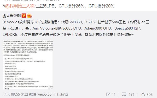 而在制程工艺方面,消息指出骁龙875会使用5纳米工艺,但是代工厂尚未完全确定。按照这一规格,高通骁龙875的CPU部分性能提升可以去到25%以上,而全新的GPU也能带来20%以上的提升。