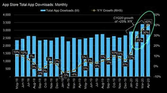 App Store总下载量也比去年同期增长了40%,这是摩根士丹利2015年开始追踪下载数据以来的最大增幅。该分析师确实预计,随着各国开始放松对冠状病毒的封锁措施,App Store的增长率将在今年第二季度达到顶峰。