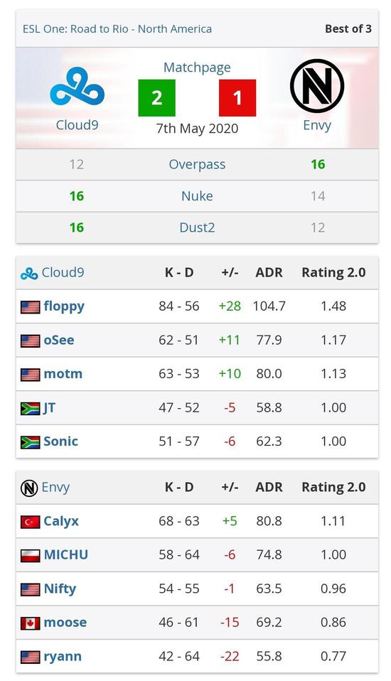 在Overpass上,motm和floppy的三杀助C9梦幻开局,但随后Nifty的大狙和moose的喷子不断化解C9进攻,Envy在上半场领先。手枪局的获胜让Envy拿到12-7的优势,虽然C9在随后扳平比分,但Envy已将C9的防守阵型摸得透彻,连续赢下关键局后以16-12获胜。