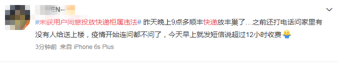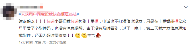 金额虽不多,却也引来许多用户的不满:“本就是快递员未经同意直接放的快递柜,除了丰巢智能柜微信公众号发了个取件码,也没有消息提醒。如果没有及时看到,还因为超时要收费!这是什么道理?!”