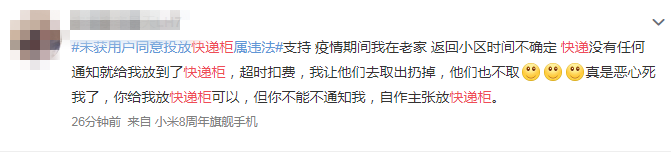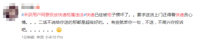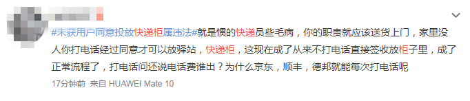 还有网友在微博上吐槽:除了京东和顺丰,从来没有接到过别的快递公司的配送电话。这种不打电话直接默认签收放快递点或者快递柜的行为,什么时候成了正常流程?