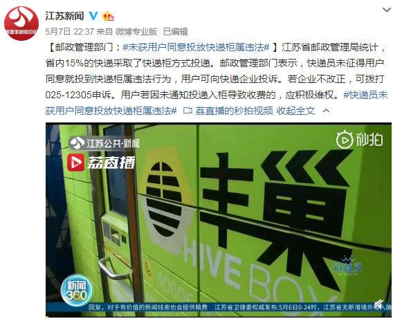 5月8日,江苏省邮政管理部门明确表示,快递员未征得用户同意就投到快递柜属违法行为,用户可向快递企业投诉。若企业不改正,可拨打12305申诉。用户若因未通知投递入柜导致收费的,应积极维权。