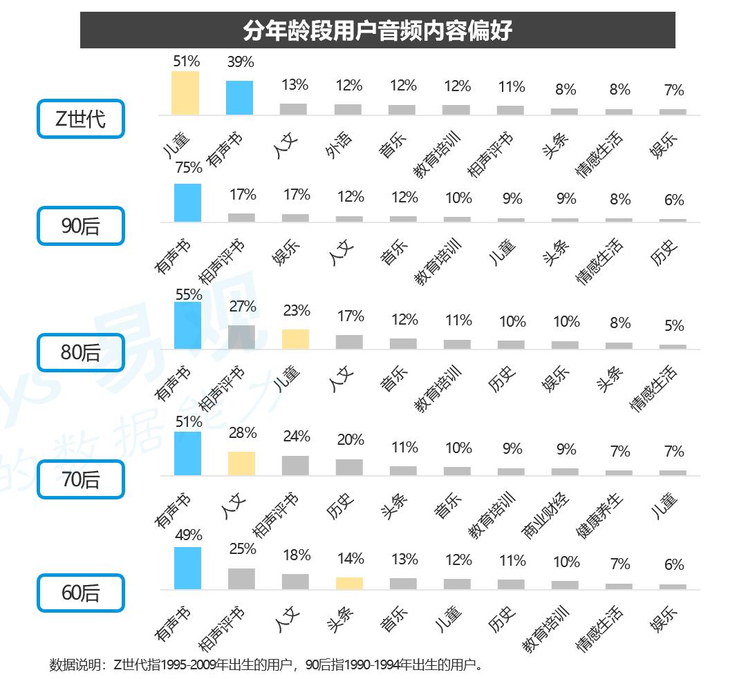 从用户端来说,越来越多的用户开始接受有声阅读这样的内容获取形式。根据第十七次全国国民阅读调查,2019年各年龄段用户听书比例相比2018年均有上升,尤其在0-17岁用户群体中增长明显,有声阅读成为新一代互联网原住民的数字化生存模式之一。