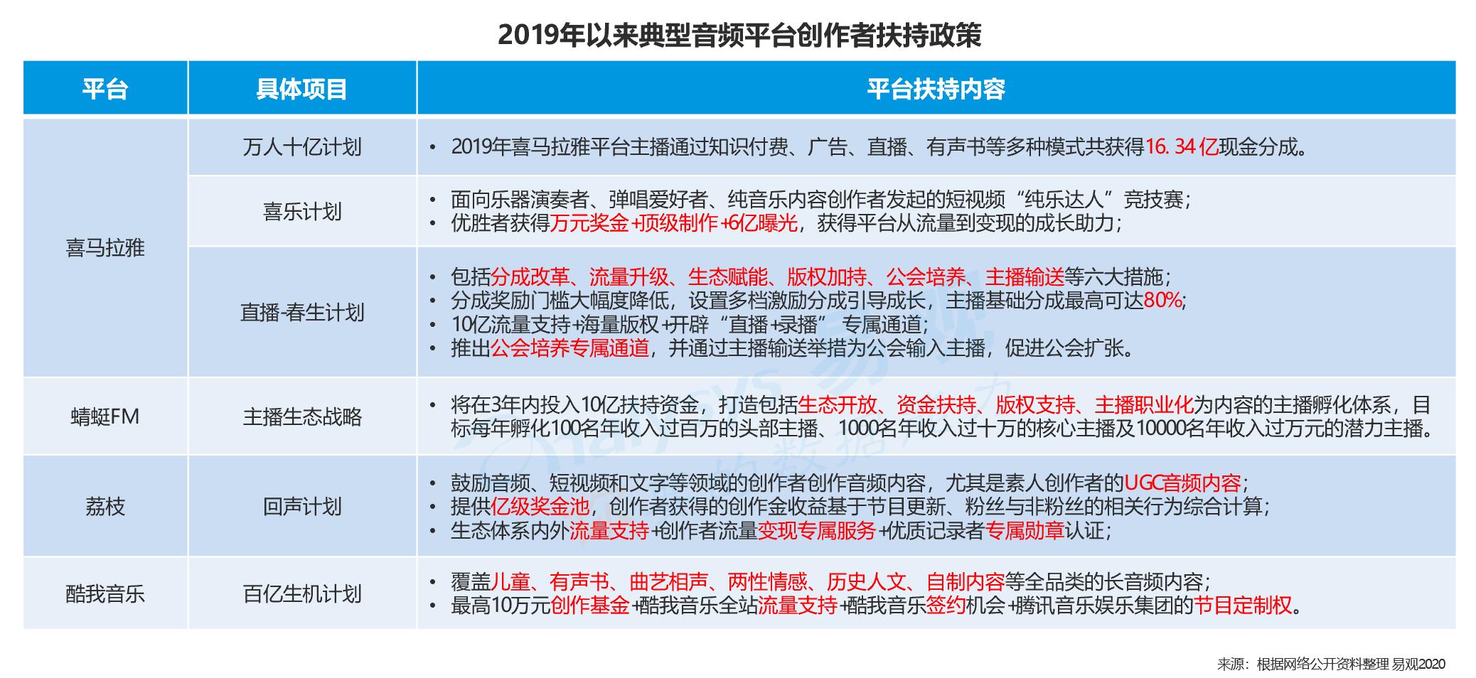 2019年,喜马拉雅平台主播通过知识付费、广告、直播、有声书等多种模式共获得16.34亿现金分成。2020年喜马拉雅为直播主播推出“春生计划”,针对优质公会、MCN机构、声优工作室推出六项扶持政策,投入10亿流量计划在2020年打造100家年收入过千万的声音机构。
