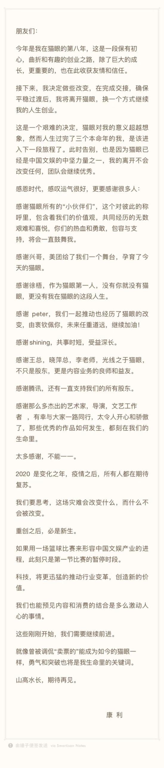 鞭牛士 5月8日消息,猫眼娱乐首席运营官康利在朋友圈宣布将离职猫眼。康利称,在完成交接,确保平稳过渡后,他将离开猫眼,换一个方式继续他的人生创业。