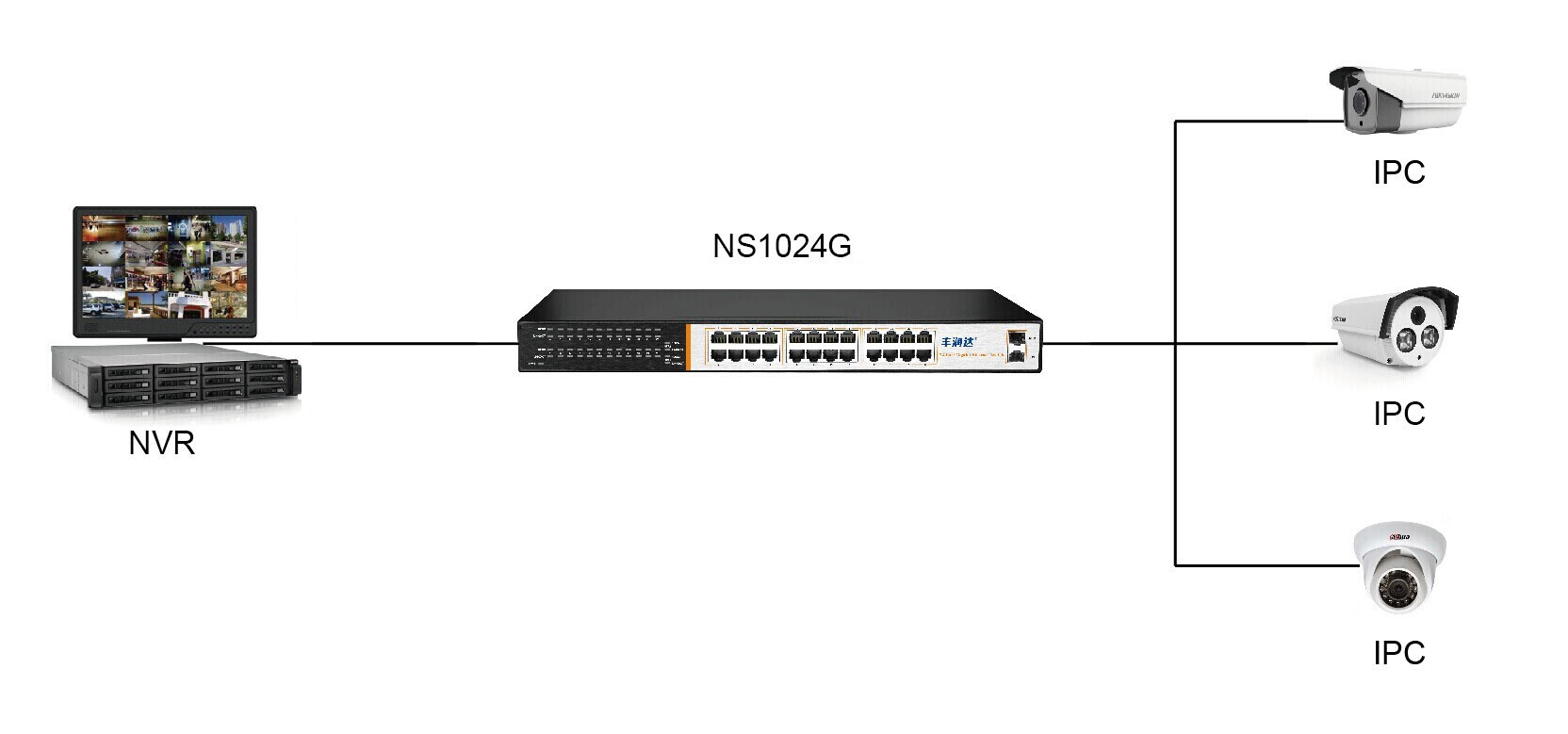 整个网络由出口路由器WAN口接入internet,丰润达交换机 NS1024G 串接在路由器的LAN口,下连摄像机完成数据传输。确保视频的流畅、稳定、快速的传输。
