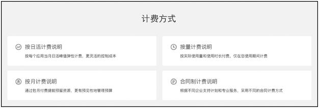 需要说明的是,在各类产品越来越精细化的价格管理背后,计费方式的管理也更加精细化,既包括内部计费控制,又包括给予客户的计费说明。下图所示为融云的计费方式,其中每个计费标准都通过独立页面做单独说明(不做展示)。